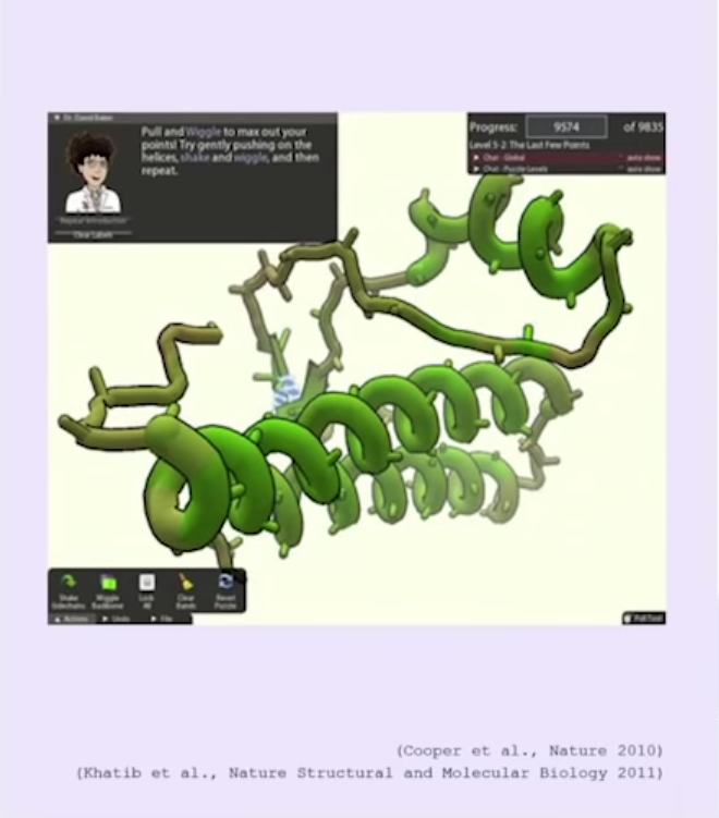 Foldit是一款由华盛顿大学等机构联合开发的蛋白质折叠游戏,玩得好的玩家能够运用自己的直觉和图形处理能力,找到正确的蛋白质折叠方式。一些由Foldit玩家破解出的重要蛋白质结构甚至还被发表到《Nature》杂志上。