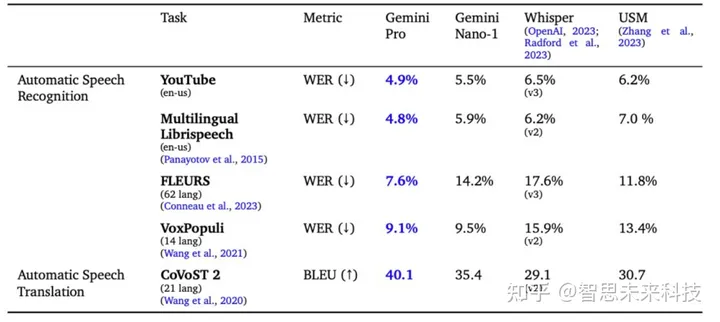 在语音识别和语音翻译任务中,Gemini 也表现出色。我们尚未对 Ultra 模型进行这些任务的评估,但我们预计模型规模的增加将带来比 Gemini Pro 模型更好的结果。Gemini Pro 模型已经在我们考察的五个基准测试中刷新了最新的最先进成果。