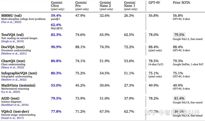 在图像理解方面,Gemini 在我们考察的所有基准测试中表现出色,Gemini Ultra 模型在每个基准测试中都刷新了最新的最先进成果。