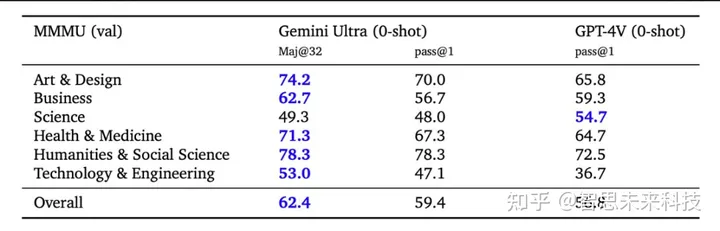 MMMU 是一个全新的基准,上周刚发布,包含约 11,500 个示例,需要图像理解、大学水平的学科知识和深思熟虑的推理。我们决定尝试在这个基准上使用 Gemini 模型,看看它们的表现如何。由于其多模态和推理能力,Gemini Ultra 在超越 GPT-4V 最先进水平上有着显著的优势。MMMU-(https://mmmu-benchmark.github.io)