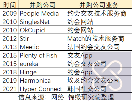 目前世界上最好的陌生人社交平台Match Group ,Tinder 的母公司。公司在2016年上市,巅峰时期市值曾达到517亿美元,在如今互联网下行的时期内,公司仍保持在200亿美元市值。Match Group的发展的核心逻辑,就是靠不断地商业并购,以此抢夺其他平台用户,最终形成宽广的用户数量壁垒。