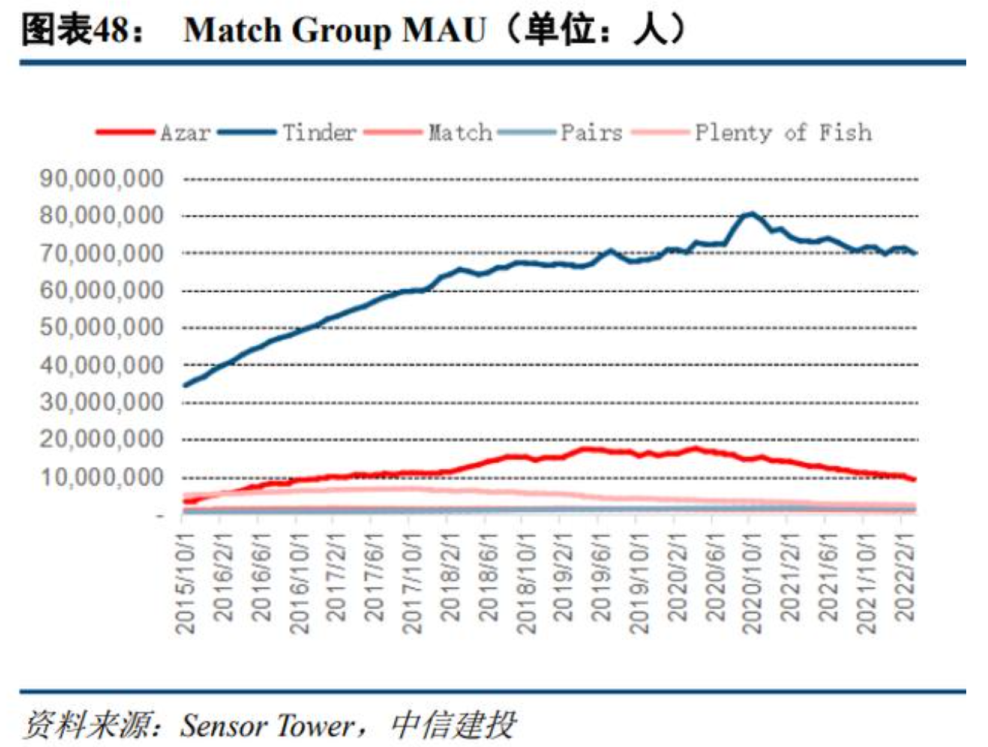随着不断并购,Match Group的MCU数据稳健增长,远远领先于其他约会软件。对比国内市场上活跃的社交应用,Match Group 具有更大的规模优势,行业龙头地位稳固,多元矩阵的产品布局亦深筑其护城河。
