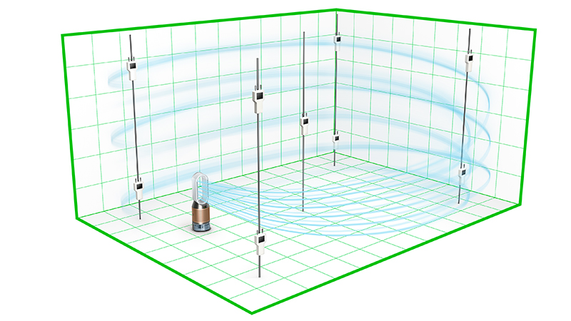 相比于传统测试,戴森工程师精益求精,在更接近平均居住空间的一个81立方米的实验室内开展POLAR测试。在不安装附加混流风扇的情况下,将空气净化设备放置在一角,并采用9个传感器持续监测整屋的空气质量数据,评估空气净化设备的过滤表现、传感性能以及整屋均匀净化效果。这一测试能够全面、有效地保障真实家庭环境中整屋空气质量的洁净与健康。