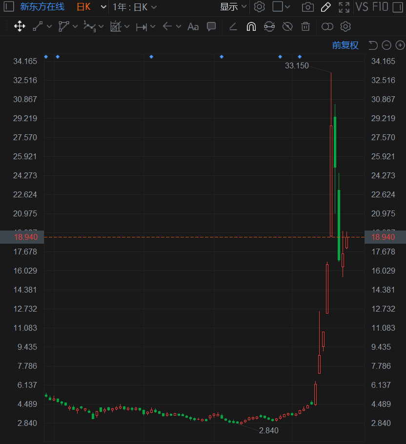 在爆红之后,新东方美股、港股股一度全线飘红。尤其是港股这边,6月10至6月16日期间新东方在线录得四连涨,16日股价收盘涨幅更是达到了72.71%,月内累计涨幅超过300%,最高触及33.15港元,创下近8个月新高。