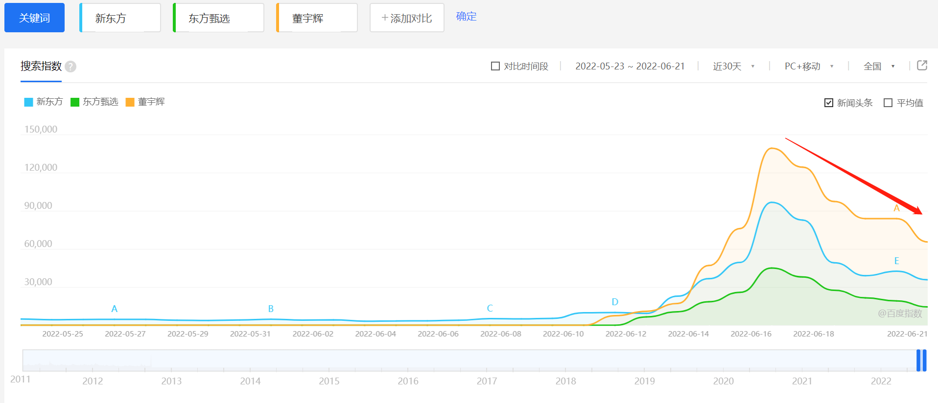 6月10日,是新东方热度攀升的开始,这一天“双语直播”、“知识直播”、“边看直播边学英语”等词条相继登上微博热搜,连同董宇辉等主播也成为了众多网友和媒体热议的焦点,彻底为东方甄选打开知名度。