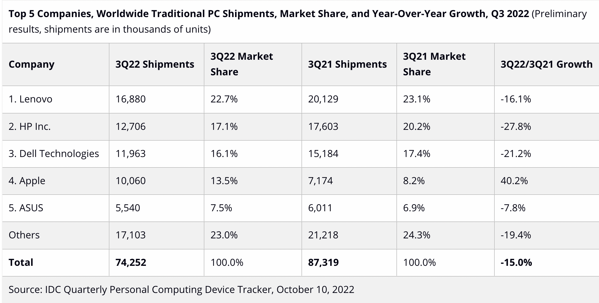 全球前四大 PC 厂商中,除了苹果(13.5%)取得逆势增长,联想(22.7%)、惠普(17.1%)和戴尔(16.1%)全线衰退,分别下滑了 16.1%、27.8% 和 21.2%。