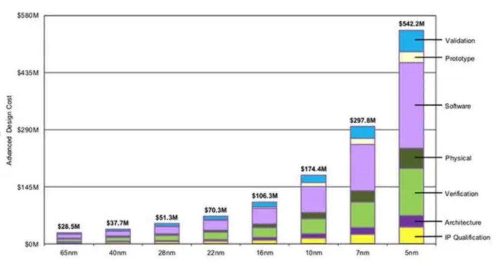 根据半导体研究机构 Semi engineering 计算,到 5nm 节点,圆晶代工厂的开发费用已经达到 5.42 亿美元,并且从 65nm 到 5nm 的趋势来看,越是接近硅基芯片的物理极限,开发费用越是飙涨。据 Diditimes 此前披露,台积电 3nm 每片圆晶的报价高达 2 万美元,下游成本大幅拉升。