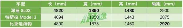 作为一款中型轿车,深蓝SL03的长宽高分别是4820/1890/1480mm,轴距2900mm。这个尺寸超过了被外界视作其竞品的特斯拉Model 3、比亚迪海豹。同为中型轿车,Model 3车长只有4694mm,海豹为4800mm,略低于深蓝SL03的4820mm,宽和高也是如此,深蓝SL03的数据表现都要优于这两款车,只有轴距方面,海豹略胜深蓝SL03 2厘米。