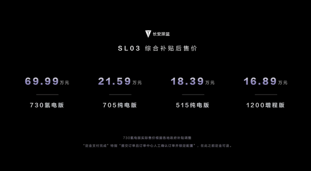 事实上,在发布会之前,深蓝SL03的相关信息就公布得差不多了,只剩售价还未公布,最终开奖:定位于中型轿车,总共四种版本,基础配置大部分一致,其中730氢电版69.99万元,705纯电版21.59万元,515纯电版18.39万元,1200增程版16.89万元。此外还有高阶智能辅助驾驶服务,限时售价2万元。