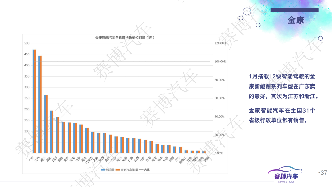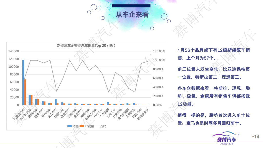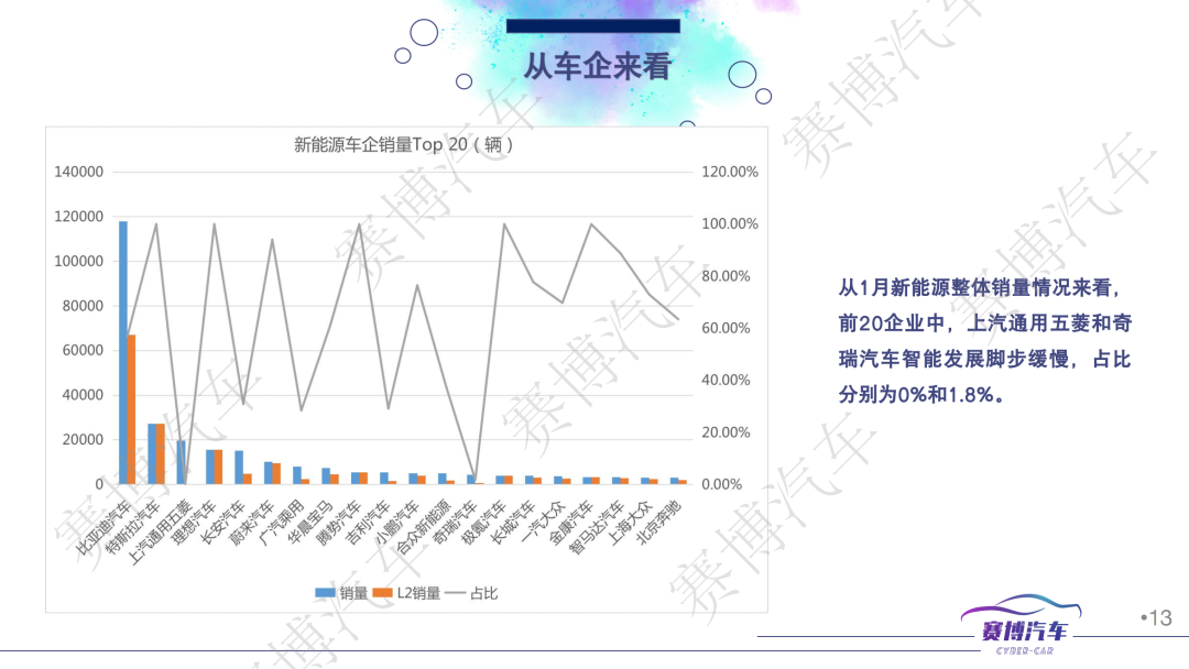 - 2023年1月共有88家车企销售新能源车,包含299款车型,其中56家车企、159款车型标配/可选配L2功能。新能源车销量中智能汽车占比为58.88%,高于去年12月的47.95%;