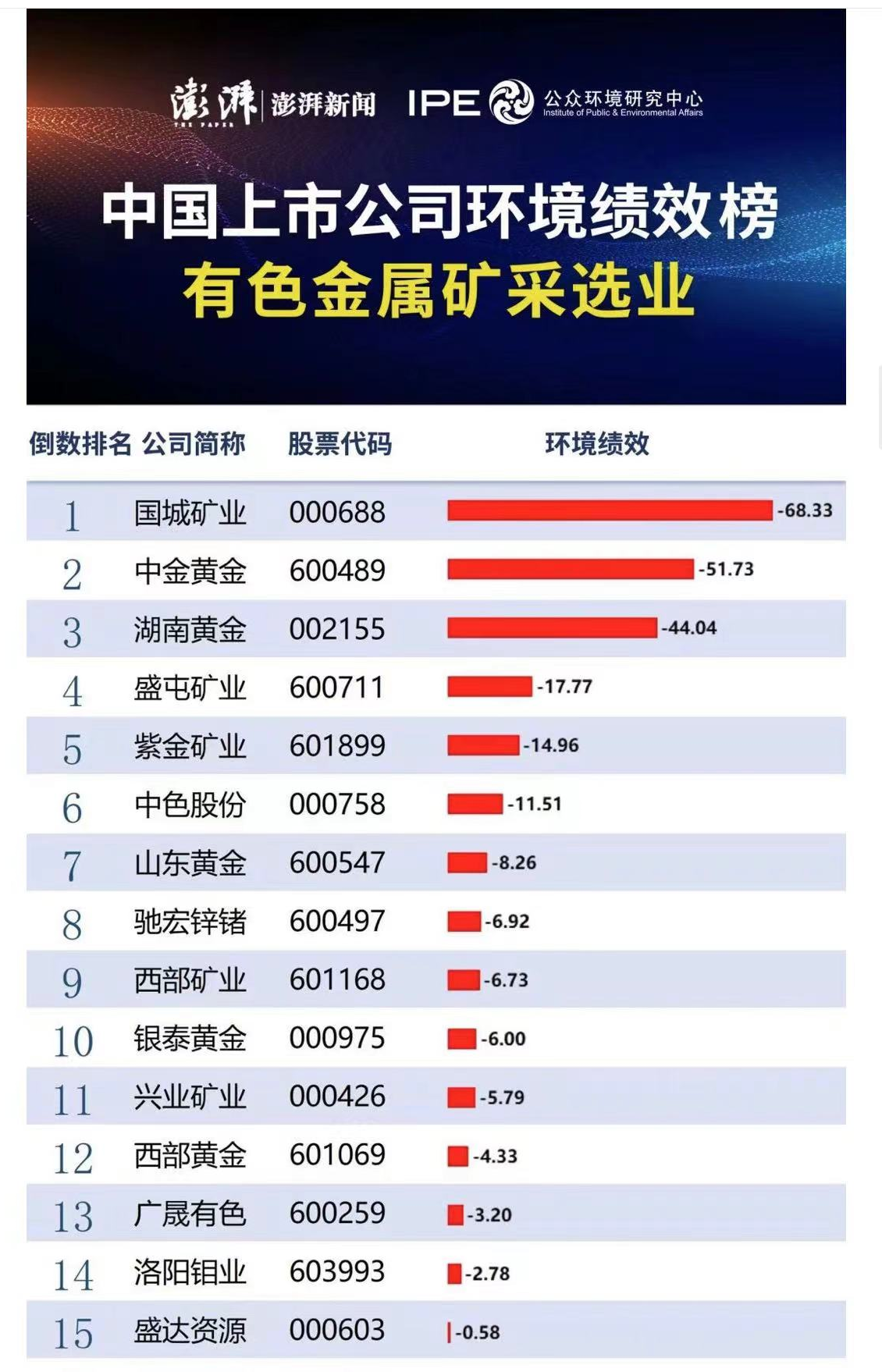 在公众环境研究中心披露的2022年中国上市公司有色金属采选行业环境绩效榜中,国城矿业以-68.33的评分位居倒数第一。