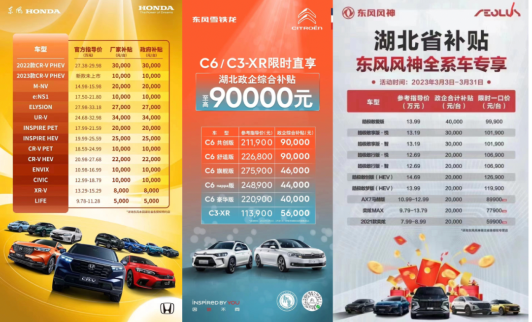 真正打响降价第一枪的则是东风汽车。作为一个近年没有太多存在感的老牌车企,东风雪铁龙在3月6日的一则降价海报引起沸腾——雪铁龙C6降价9万,只需12万元。C6打头,东风旗下的东风本田、标志、日产、富康等7大品牌近60款车型开始大跳水。