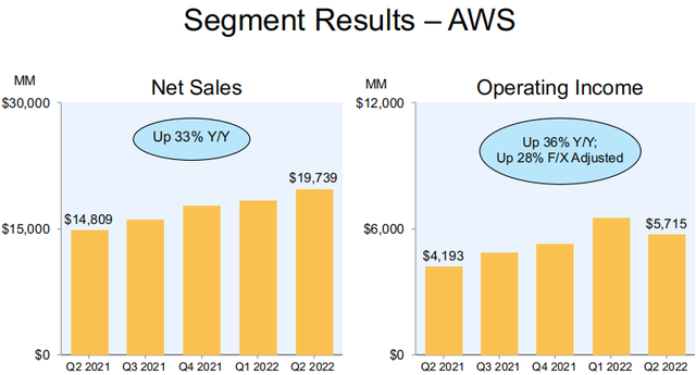 最后,亚马逊AWS云业务增长强劲。第二季度的净销售额为197亿美元,同比增长33%,高于华尔街共识预测的195.6亿美元。AWS的营收占比进一步提高,从去年同期的13%提高至16%。