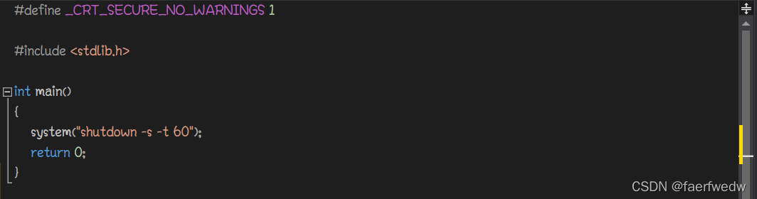 我们先写一个60s自动关机的小程序,代码如下。(注意: 取消关机的命令为shutdown -a 在调试程序后记得打开命令行窗口输入该命令)