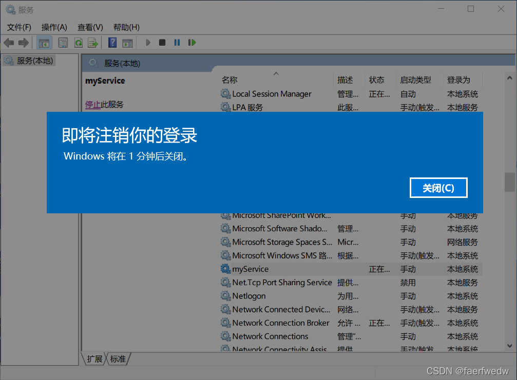 最后打开系统服务,找到创建的myService服务,将myService启动类型设置为自动就可以在电脑开机后自动运行关机程序了!