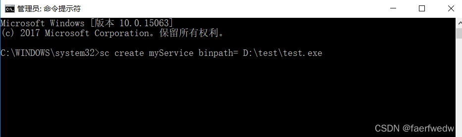 首先以管理员身份运行cmd命令行窗口,接着输入下面的命令。其中myService为创建的本地服务名称,binpath为exe程序所在的绝对路径。