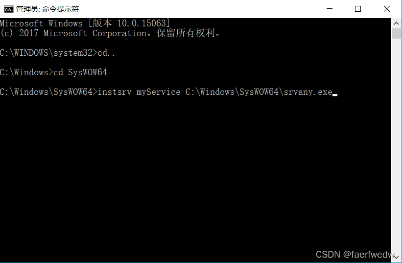 接着以管理员身份打开cmd,进入到C:\Windows\SysWOW64目录(windows32位系统则进入C:\Windows\system32目录),输入命令:instsrv myService C:\Windows\SysWOW64\srvany.exe