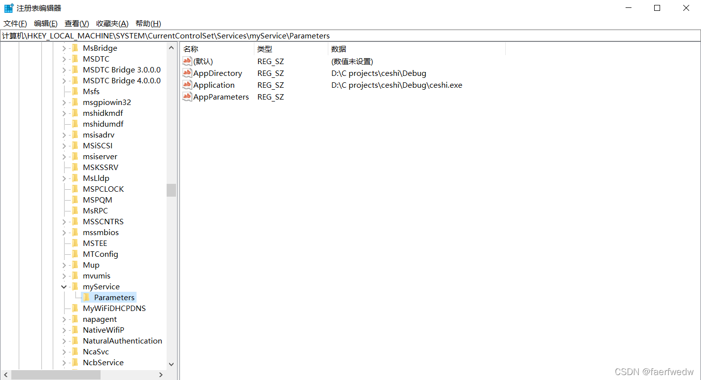 HKEY_LOCAL_MACHINE\SYSTEM\CurrentControlSet\Services目录下找到myService(之前创建的服务名称)。右击myService,点击“新建项”,命名为“Parameters”。然后在Parameters中新建几个字符串值。