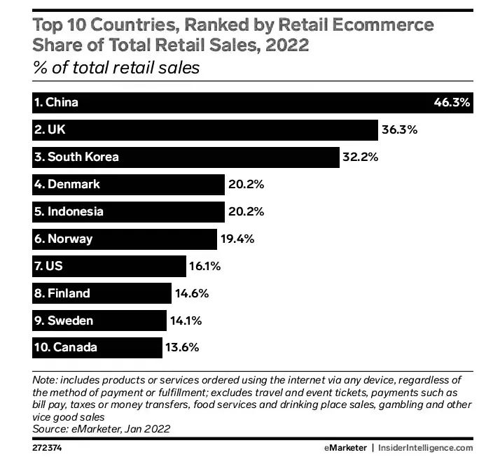 目前,韩国市场电商渗透率(电商销售额占零售总额百分比)非常高。据eMarketer公布的数据,2022年1月,全球电商渗透率前十的国家,中国、英国和韩国牢牢占据前三位。中国达到了46.3%,而韩国也达到了32.2%,还有非常不错的增长潜力。