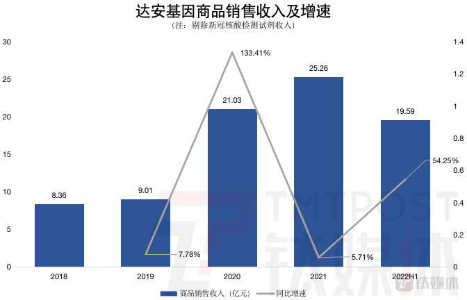 达安基因的商品销售产品板块,2022年上半年,该板块收入同比增长93.94%至65.93亿元,除去新冠核酸检测试剂盒的创收,其商品销售收入为19.59亿元,同比增长54.25%。
