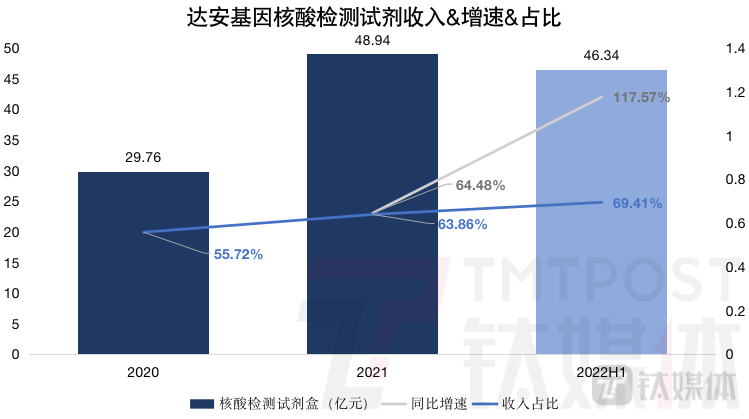 2020年至2022年上半年,达安基因的核酸检测试剂盒销售收入增速连年上涨、占比不断增大。