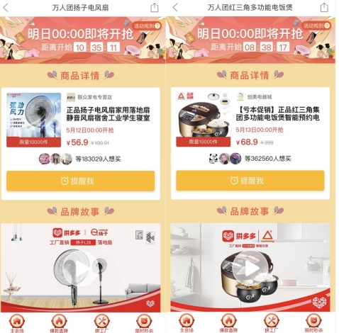 从母婴用品到个护家清,从苏泊尔、美的到格兰仕、海尔,拼多多上各类爆款产品同型号的售价都低过了天猫淘宝京东,真正做到了“击穿底价”。口口相传之下,拼多多“限时万人拼团”目标,平均达成率超过60%,一些爆款产品一经放出甚至会有数十万用户预约抢购。