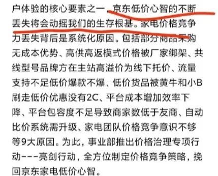 2022年10月27日,一则刘强东回复京东家电事业部总裁谢帆的内部邮件,在电商群传开。邮件中,用了“触目惊心”来形容京东家电产品在与同行比价后的结果,痛斥团队的“兄弟们”夜郎自大没有危机意识,就像当年苏宁看不懂京东的高速增长一样,对竞争对手的逆势增长视而不见,导致京东失去了在消费者心中的“低价心智”,并直言这样下去将直接动摇京东生存的根基。