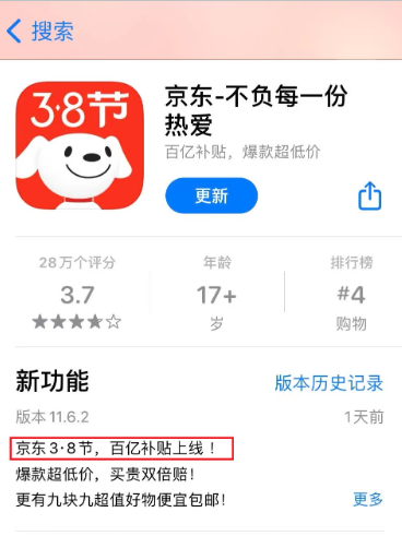 京东APP 11.6.2版本提出“百亿补贴” 图源:App Store