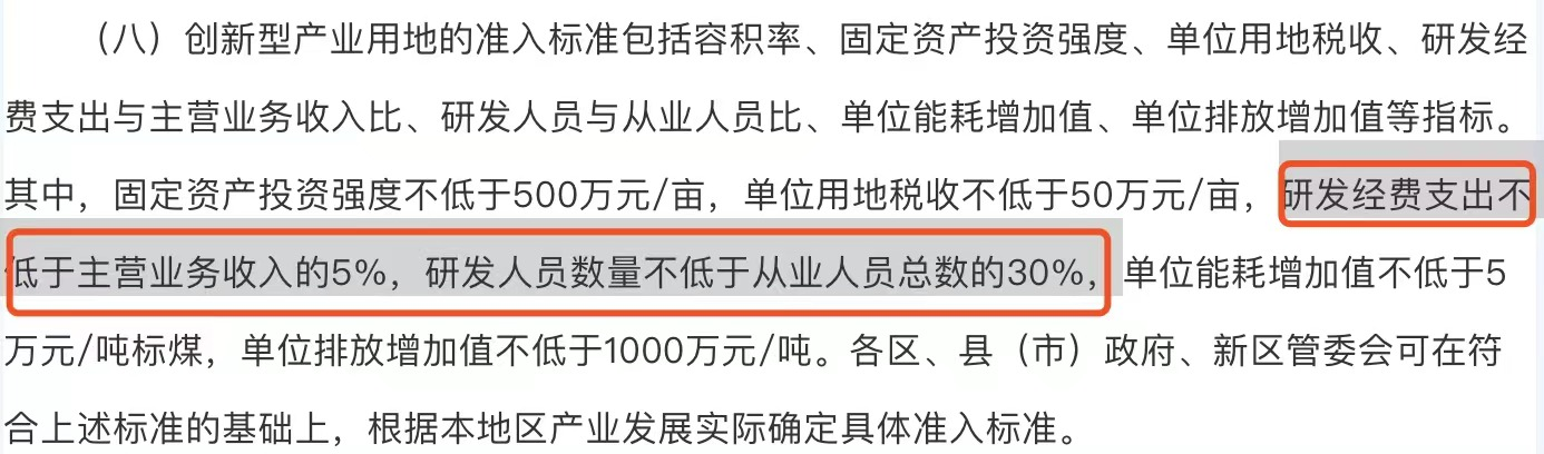 除了研发人员占比之外,上述地块还有研发费用占比的要求。在《杭州市人民政府办公厅关于进一步规范全市创新型产业用地管理的意见(杭政办【2019】2号)》中,明确提及“研发经费支出不低于主营业务收入的5%,研发人员数量不低于从业人员总数的30%”等要求。