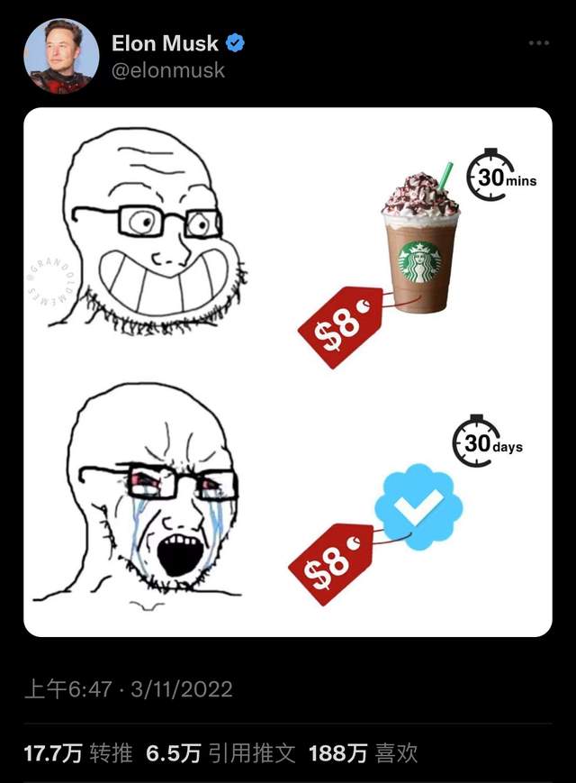 关于会员制的另一个争论是,用户和推特谁应该是付钱的一方。马斯克坚持认为用户应该交钱,他为此还专门发了一张meme的图,讽刺用户愿意花8块钱买一杯咖啡快乐30分钟,但不愿意花8块钱买个推特会员快乐1个月。但一些专栏作家对此的态度是:去你的会员制,推特应该为我的内容付钱。