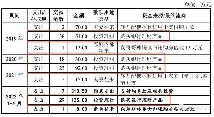 对妻子及其娘家出手大方,林锡臻对自己的妹妹更是加倍宠爱,除了职位和股权,林秋群买房时,林锡臻先是给了20万,后来又借了15万。买房之外,林秋群还有不少支出用于购买银行理财,近三年半时间,其用于购买理财的支出达298万元。