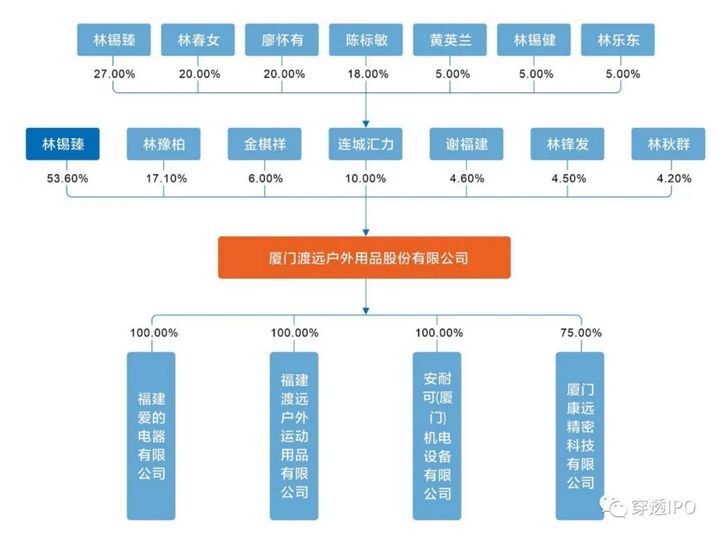林锡臻的两个妹妹林秋群、林春女,前者直接持有渡远户外4.20%的股份,出任公司总经理助理;后者通过连城汇力间接持股2.00%,在核心子公司福建爱的担任销售经理。此外,林锡臻的堂姐夫林乐东,远堂兄弟林锡健各持股持股0.50%。