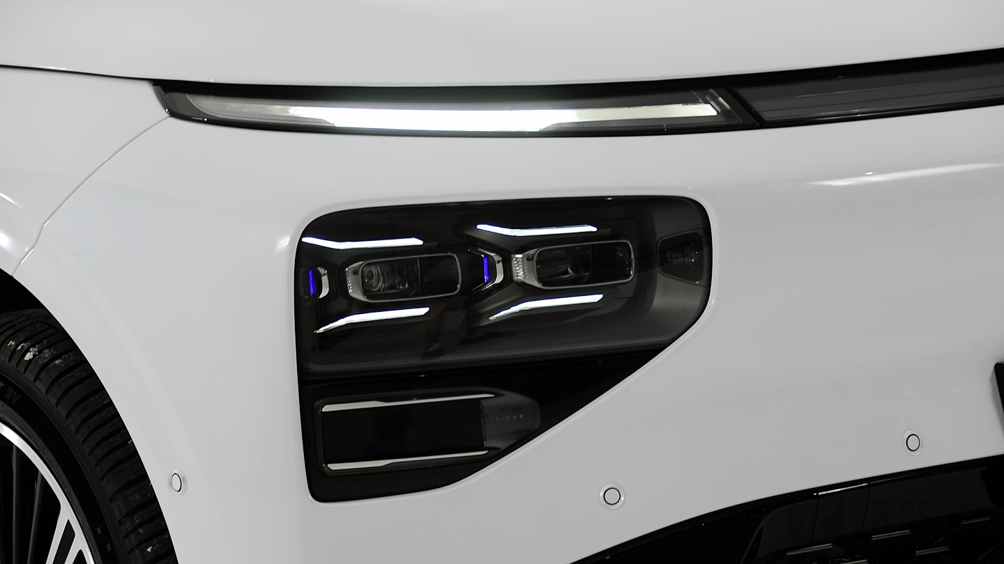 自感应全LED前大灯采用远近光双眼灯组加上下分布式灯带,实现了前大灯造型在空间上与整车造型的协调性。照明范围大,路⾯照明最远可达约200m,转向辅助照明功能在夜间车辆转弯时照亮转弯⻆落,夜间照明范围扩大,增加行车安全。