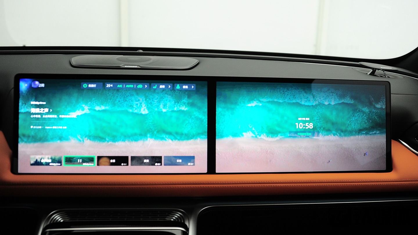 在智能座舱部分,硬件上,使用了高通8155芯片;双14.96英寸联体屏支持2K分辨率,2400*1200分辨率,PPI 179,屏幕显示细腻。双联体屏的主屏和副屏之间的信息流转顺畅,主副驾可相互分享内容给对方的屏幕。