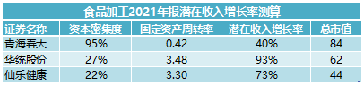 食品加工行业符合条件的有三只股票,青海春天、华统股份和仙乐健康。