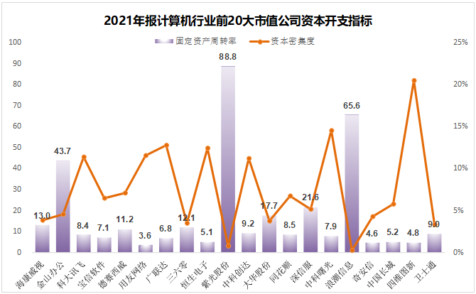 上图是申万计算机行业市值前20大公司的资本密集度和固定资产周转率指标。市值最大的海康威视,3000亿,最小的卫士通,300亿,相差10倍。