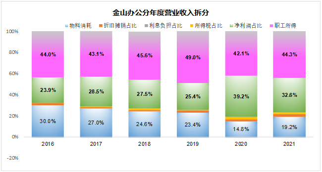 金山办公是大众心目中的计算机行业的典型代表。2021年全部营业收入中,物料消耗只有19.2%,员工薪酬占44.3%,近乎是物料消耗的2倍,销售净利率高达32.6%。