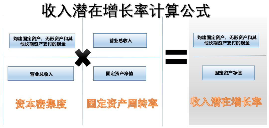 这么转换下来, 企业收入的潜在增速,就可以变成企业资本开支的强度与杠杆的乘积。 资本开支强度越高,杠杆放的越大,企业的潜在收入增速就越高。