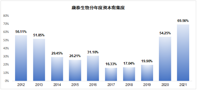 尤其康泰生物,虽然股价一路向下,但至少从财务指标上看,收入和净利润都在往上走,这两年资本开支强度也屡创新高,2021年54%,2021年报高达70%。