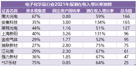 根据我们上面资本开支法的两个择股标准,将每个细分行业内资本密集度大于20%并且固定资产周转率小于10的公司给大家列了出来。上市公司用真金白银的资本开支,用脚投票,来表示对自己行业发展前途的看好。我们要做的是,判断行业是不是能支持这么高的增速。