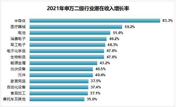 在我们排除那些人力资源推动型、项目推动型以及资本金推动型行业之后,我们从二级行业角度,找出了2021年行业中位数潜在收入增长率大于35%的14个行业,如上图。