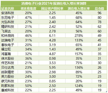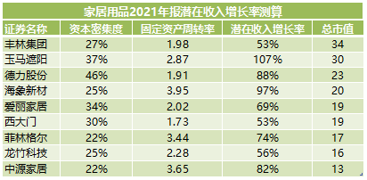 除了上述三个行业,还有六个细分行业的中位数潜在收入增长率在35%以上,分别是军工电子、能源金属、家居用品、自动化设备、食品加工、摩托车及其他。