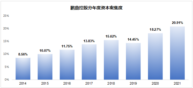 分年度看,鹏鼎控股的资本密集度总体是在增加的,显示公司的资本开支强度每年都在增加。