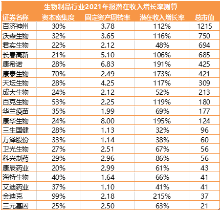 作为医药生物行业的成长赛道,几家大市值的生物制品公司整体的资本开支强度还是很高,比如百济神州、沃森生物、君实生物、长春高新、康希诺、康泰生物等。