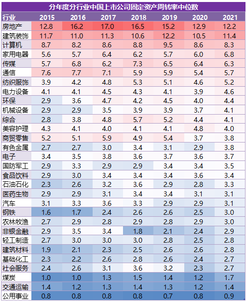 关于固定资产周转率,教科书认为,当经营收入与固定资产关系不大时,固定资产周转率的意义不大。从上市公司数据看,固定资产周转率明显比较高的行业是房地产、建筑装饰、计算机。这三个行业我们知道都不是资本开支驱动的,所以高的周转率意义不大。较低的行业有公用事业、交通运输、煤炭等,这三个行业总体上都属于重资产行业,固定资产放杠杆的能力确实不强。