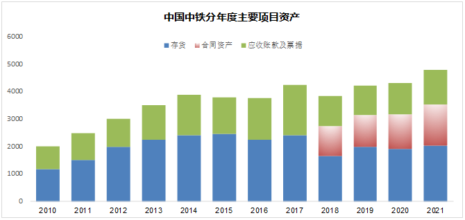 从2021年报来看,中国中铁共有固定资产676亿,绝对数量很大,但其他资产更多,中国中铁的应收账款1271亿,存货有2034亿,全部流动资产高达8000亿,显然固定资产并不是驱动公司成长的发动机,因为项目扩张而增加的项目类资产才是驱动增长的表征变量,这类项目类资产通常包括三大项,即应收票据及应收账款、存货和合同资产。