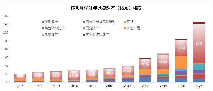 伟明环保2021年报总资产147亿人民币,这其中无形资产就有94亿,占比接近三分之二,而这么重要的项目,在年报中还不到一页,研究难度很大。