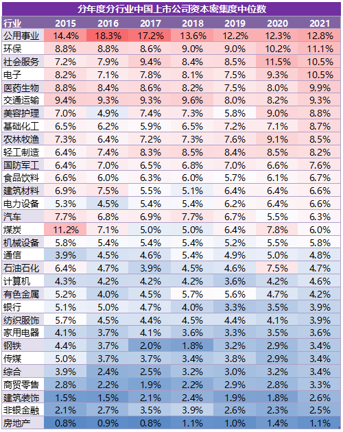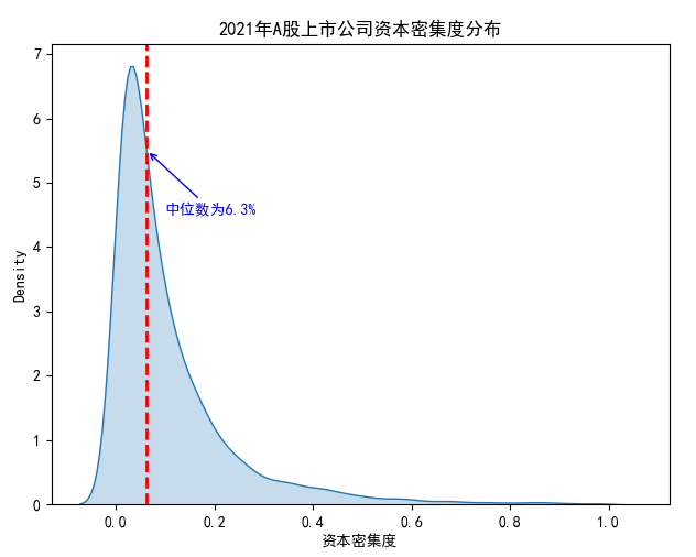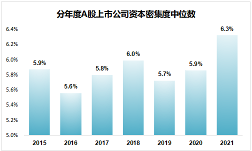 从A股上市公司的数据来看,2021年中位数的资本密集度度为6.3%,这个数字总体并不高,因为我们A股上市公司营业收入中折旧摊销的占比,在2021年平均是5.6%,这代表上市公司总体的资本开支,刚刚好能够覆盖折旧摊销这种维持简单再生产所需要的水平。