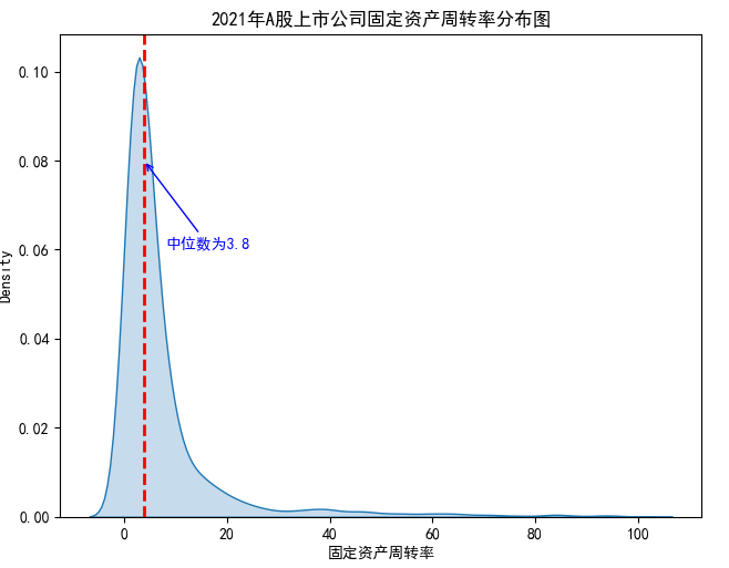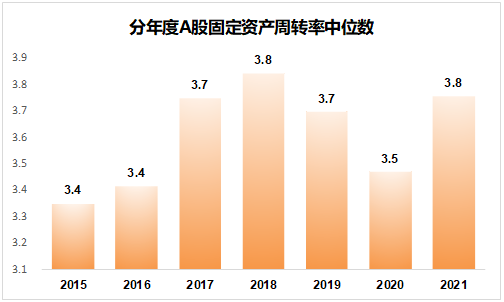 从分布上看,固定资产周转率的中位数与分布的最高点非常接近,也就是说,A股一个普通的上市公司,每一块钱的固定资产,可以撬动3.8元的营业收入。