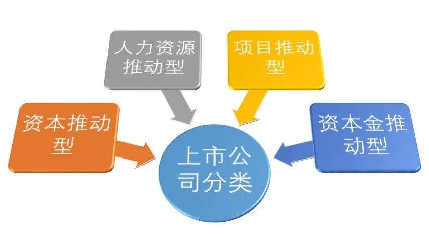 我们可以用经验将上市公司分成四类,资本推动型,人力资源推动型、项目推动型以及资本金推动型。